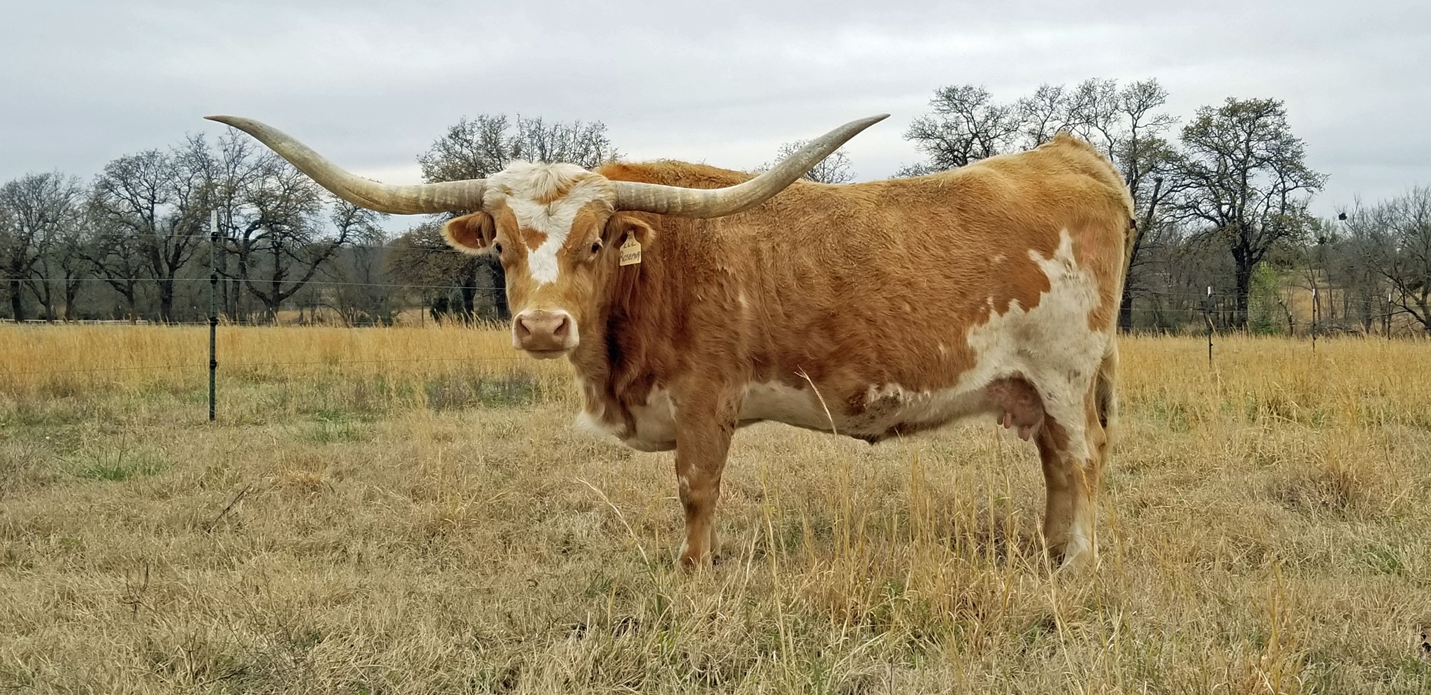 This is one of our best cows!!! She is currently over 80" total horn. She produced HR Slam's Rose, HR Rosebud, Big Red HR, Rowdy HR and many others....bull or heifer, makes no difference, they are winners. Confirmed pregnant to RHF Sharp Shooter for a May 2022 calf.